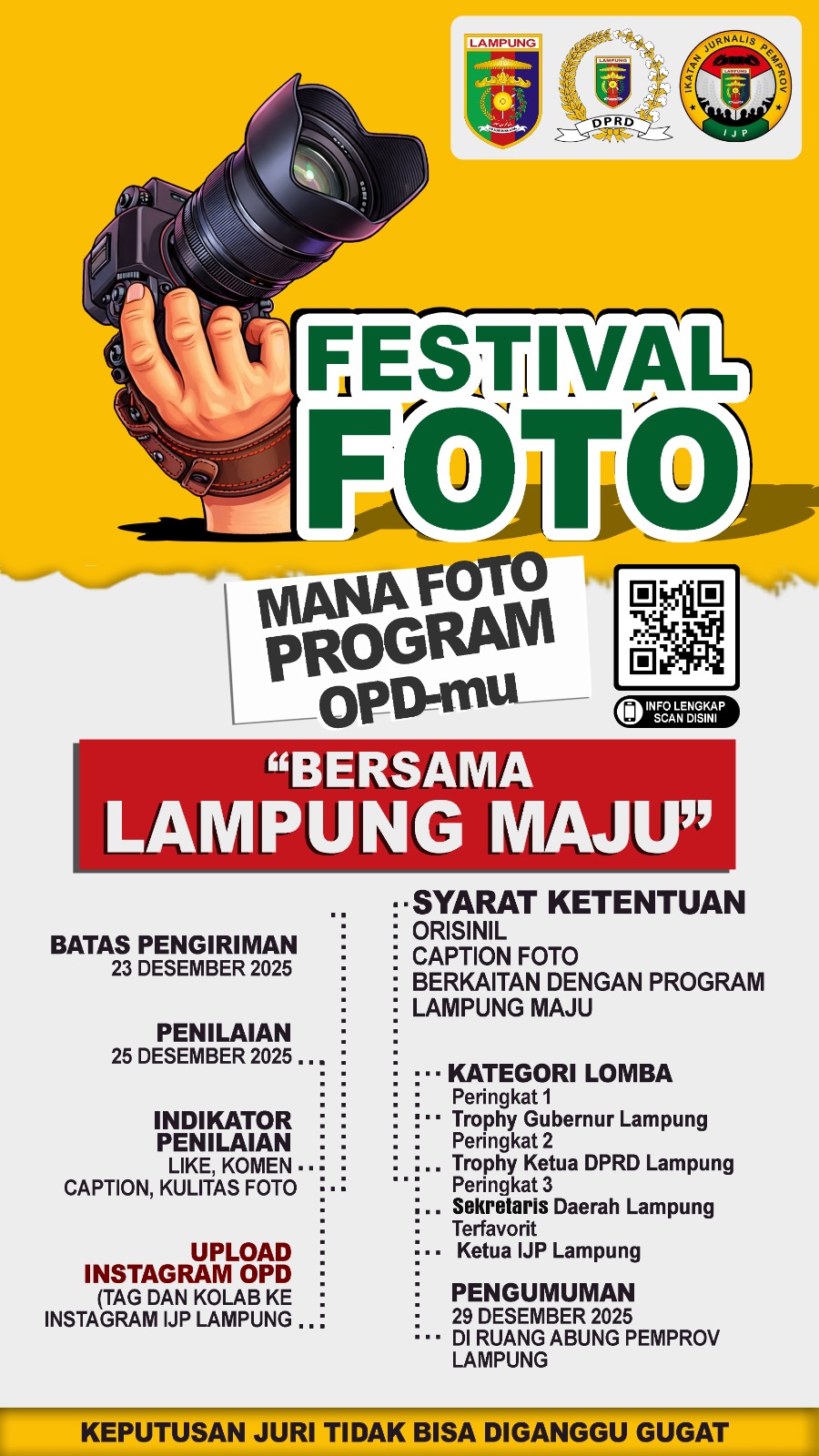 Keputusan juri bersifat mutlak dan tidak dapat diganggu gugat. Festival Foto “Bersama Lampung Maju” menjadi salah satu langkah IJP dalam mendukung publikasi pembangunan berkelanjutan dan memperkuat branding Provinsi Lampung sebagai daerah yang terus berinovasi, maju, dan berdaya saing.