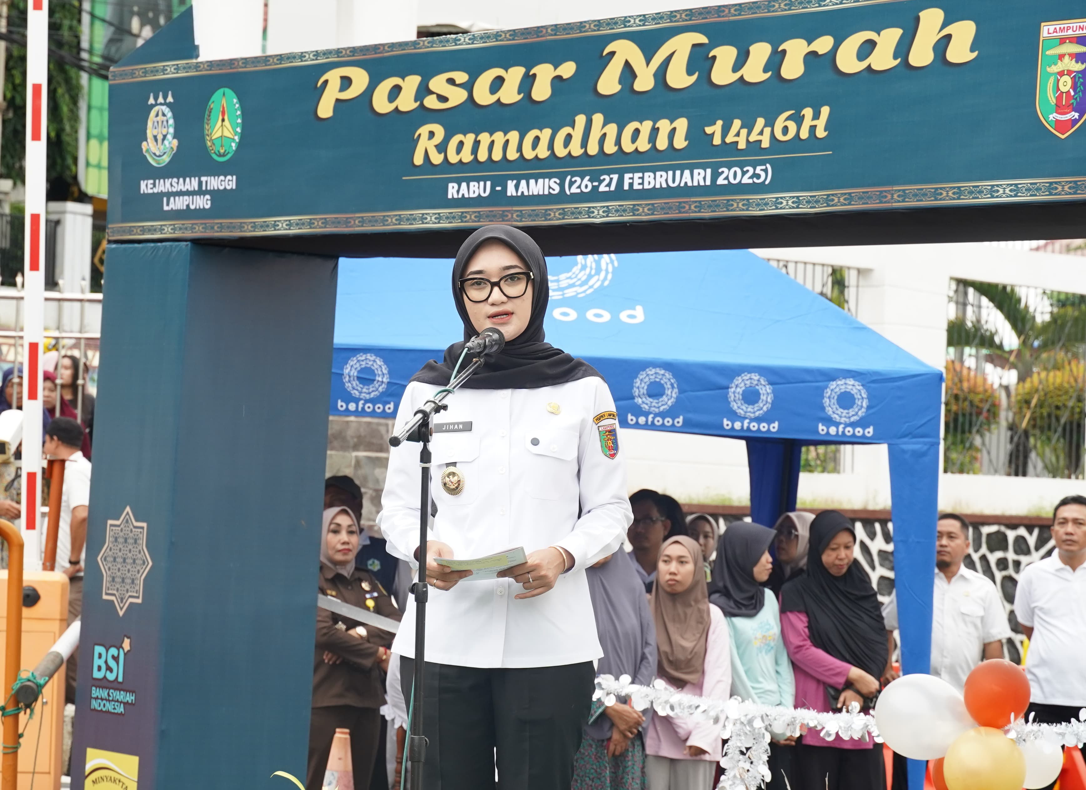 Bandar Lampung — Wakil Gubernur Lampung, Jihan Nurlela, meninjau langsung pelaksanaan Bazar Pasar Murah Ramadan yang diselenggarakan oleh Kejaksaan Tinggi Lampung di halaman Kantor Kejati Lampung pada Rabu (26/02/2025).